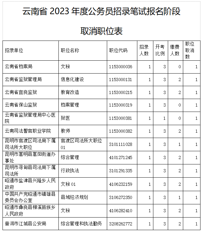 附件:1.云南省2023年度公務(wù)員招錄筆試報名階段取消職位表