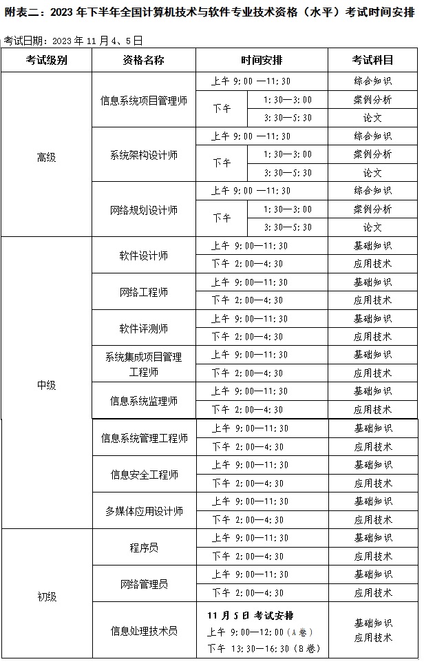 二、《2023年下半年全國(guó)計(jì)算機(jī)技術(shù)與軟件專業(yè)技術(shù)資格(水平)考試時(shí)間安排》