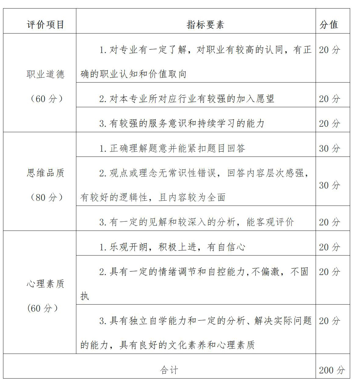 采用“普通高中學業(yè)水平考試量化分數(總分220分)”+職業(yè)適應性綜合素質測試(筆試總分200分)的評價方式,“普通高中學業(yè)水平考試”共11門學科(語文、數學、外語、思想政治、歷史、地理、物理、化學、生物、信息技術及通用技術),按考生每個科目最好成績進行量化(A等20分、B等16分、C等12分、D等8分),量化分數滿分為220分。職業(yè)適應性綜合素質測試分值200分(測試的具體時間安排詳見本校網站公告),普通高中畢業(yè)生高職單招滿分分值420分。