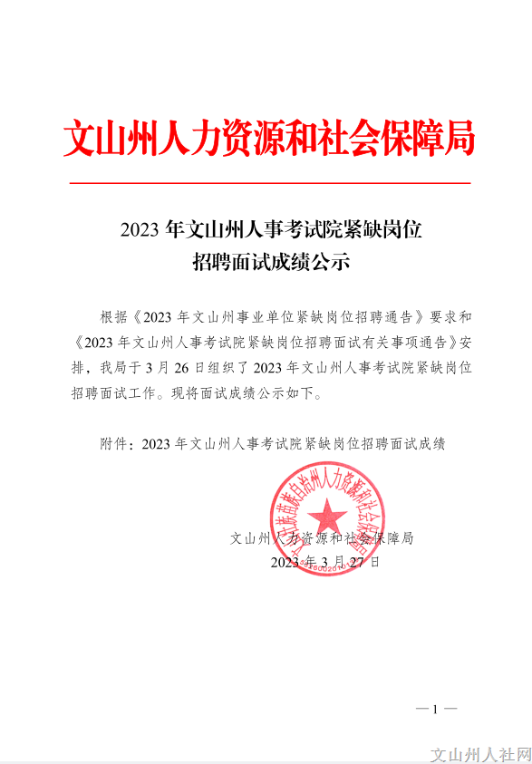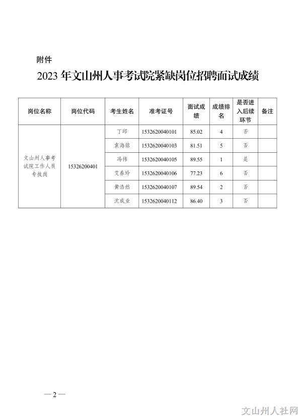 2023年文山州人事考試院緊缺崗位招聘面試成績(jī)公示
