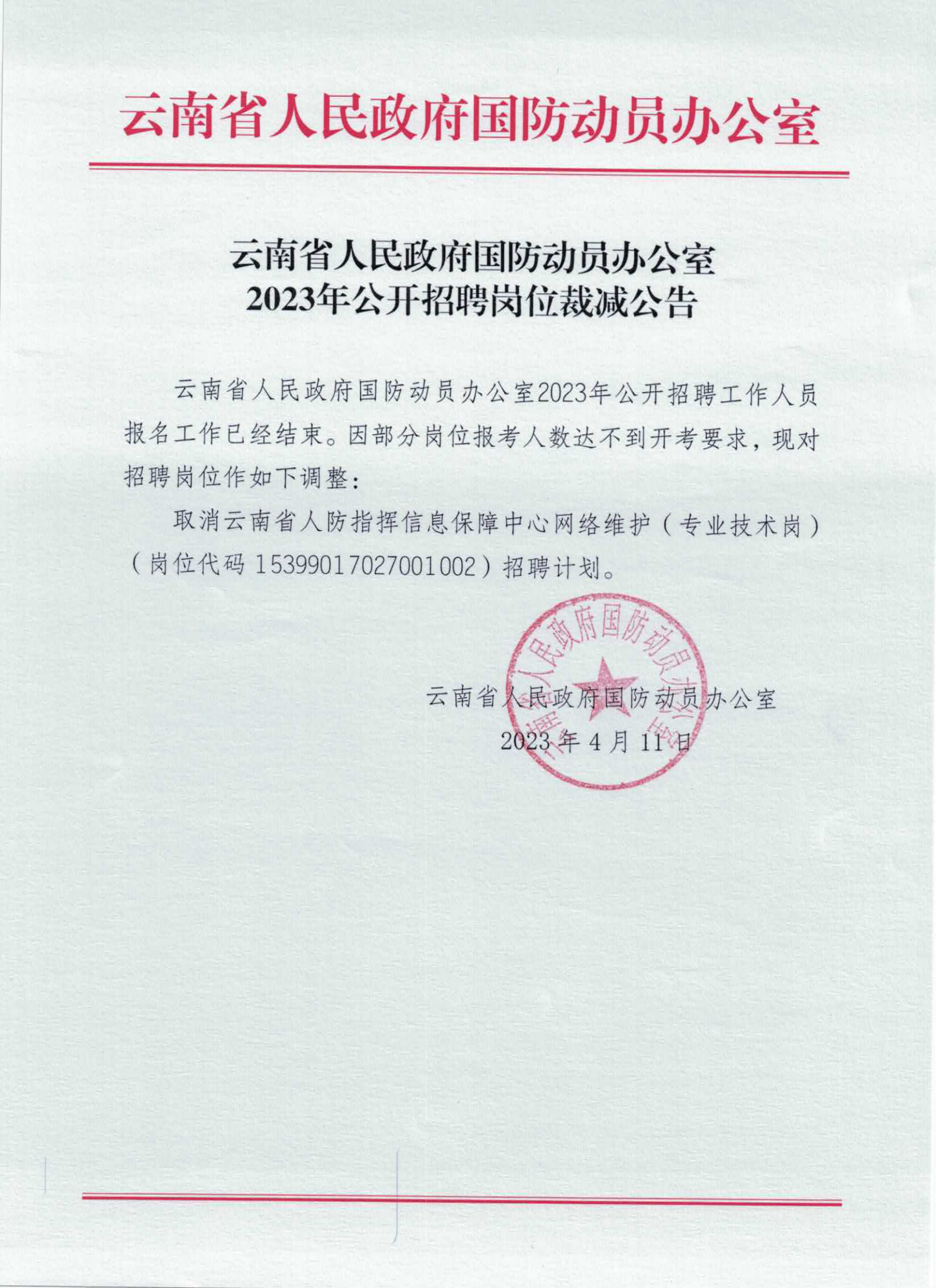 2023年云南省人民政府國防動員辦公室招聘崗位裁減公告