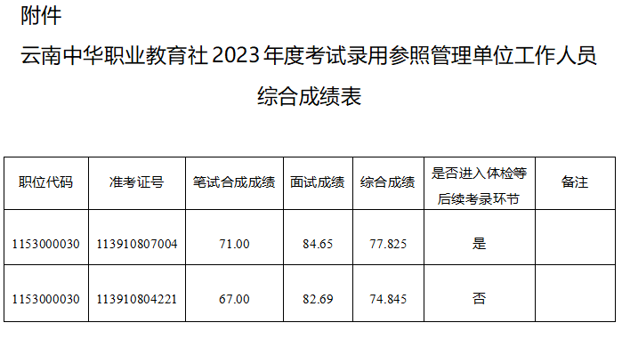 根據(jù)云南省2023年度考試錄用公務(wù)員工作安排,筆試、面試工作已經(jīng)結(jié)束,現(xiàn)將報(bào)考云南中華職業(yè)教育社參照管理單位工作人員考生綜合成績及后續(xù)工作安排公告如下。