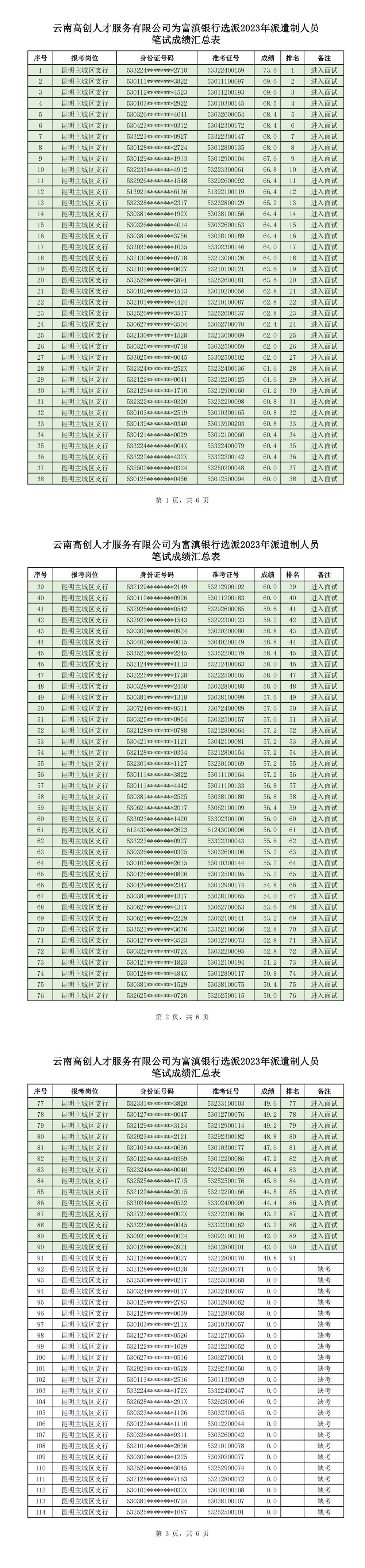 根據(jù)云南高創(chuàng)人才服務(wù)有限公司為富滇銀行選派2023年勞務(wù)派遣制人員工作的相關(guān)程序和規(guī)定,現(xiàn)對(duì)筆試成績(jī)進(jìn)行公示。