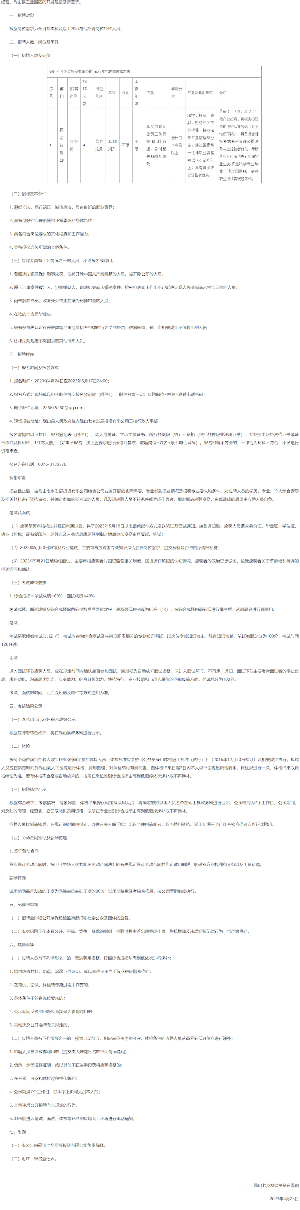 硯山七鄉(xiāng)發(fā)展投資有限公司2023年公開招聘工作人員的公告