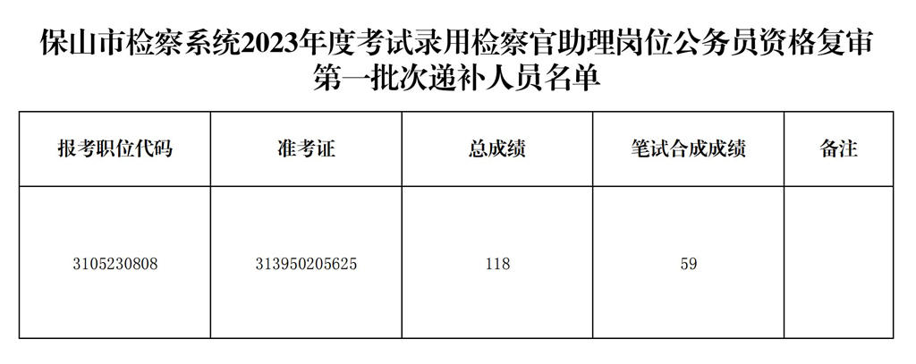 根據(jù)《云南省2023年度考試錄用公務(wù)員公告》、云南省人民檢察院《關(guān)于做好2023年度考試錄用公務(wù)員資格復(fù)審工作的通知》要求,現(xiàn)將保山市檢察系統(tǒng)2023年度考試錄用檢察官助理崗位公務(wù)員資格復(fù)審第一批次遞補(bǔ)工作相關(guān)事項公告如下: