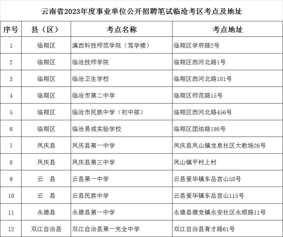 附件:云南省2023年度事業(yè)單位公開招聘筆試臨滄考區(qū)考點(diǎn)及地址