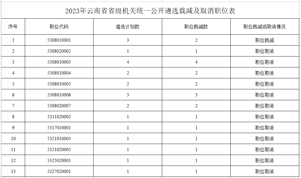 2023年云南省省級機關統(tǒng)一公開遴選公務員報名、資格審查、網(wǎng)上繳費工作已結束。按照《2023年云南省省級機關統(tǒng)一公開遴選公務員公告》,須對未達到開考比例的1個職位進行裁減、12個職位進行取消,詳見《2023年云南省省級機關統(tǒng)一公開遴選裁減及取消職位表》。