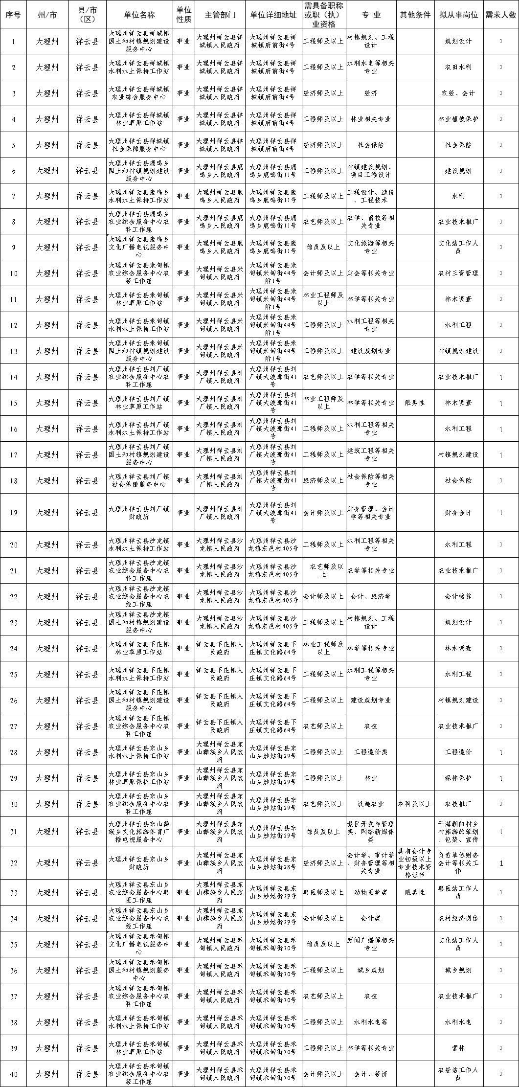 為進一步貫徹落實省委、省政府《關(guān)于創(chuàng)新體制機制加強人才工作的意見》(云發(fā)〔2014〕1號)文件精神,省人力資源和社會保障廳、省財政廳下發(fā)《云南省鼓勵專業(yè)技術(shù)人員到基層服務(wù)暫行辦法》(云人社發(fā)〔2014〕97號)對全省鼓勵專業(yè)技術(shù)人員到基層服務(wù)工作進行了安排部署。通過對我縣各鄉(xiāng)鎮(zhèn)廣泛征集、篩選,共有40個崗位40人(具體崗位見附表)急需提供相應的專業(yè)技術(shù)服務(wù),現(xiàn)予以公告。熱忱歡迎符合條件的廣大專業(yè)技術(shù)人員到我縣鄉(xiāng)鎮(zhèn)基層開展服務(wù)工作,切實幫助基層解決一些生產(chǎn)和生活中的專業(yè)技術(shù)難題。專業(yè)技術(shù)人員服務(wù)鄉(xiāng)鎮(zhèn)基層工作按照省人力資源和社會保障廳、省財政廳《云南省鼓勵專業(yè)技術(shù)人員到基層服務(wù)暫行辦法》(云人社發(fā)〔2014〕97號)的相關(guān)規(guī)定開展,符合條件人選經(jīng)單位批準、主管部門審核同意后報同級人力資源和社會保障部門,由同級人力資源和社會保障部門負責與服務(wù)單位聯(lián)系落實服務(wù)基層相關(guān)事宜。專業(yè)技術(shù)人員服務(wù)鄉(xiāng)鎮(zhèn)基層期滿補助按照《中共大理州委大理州人民政府關(guān)于創(chuàng)新體制機制加強人才工作的實施意見》(大發(fā)〔2014〕23號)文件規(guī)定執(zhí)行。