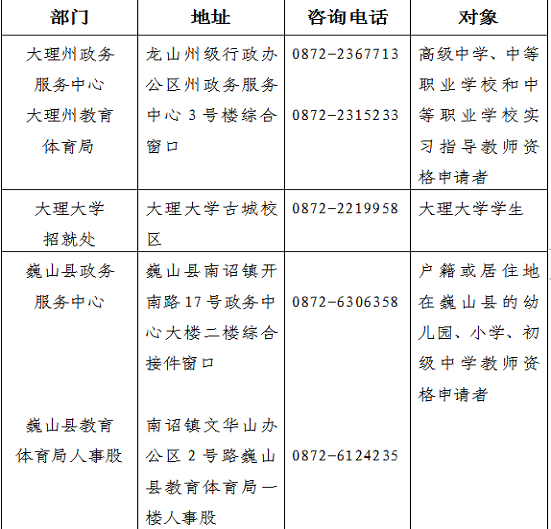 2.高級(jí)中學(xué)教師資格、中等職業(yè)學(xué)校教師資格和中等職業(yè)學(xué)校實(shí)習(xí)指導(dǎo)教師資格,由大理州教育體育局認(rèn)定,詳情見(jiàn)《大理州2023年中小學(xué)教師資格認(rèn)定公告》(咨詢電話:0872-2315233,網(wǎng)址:http://www.dali.gov.cn/)。