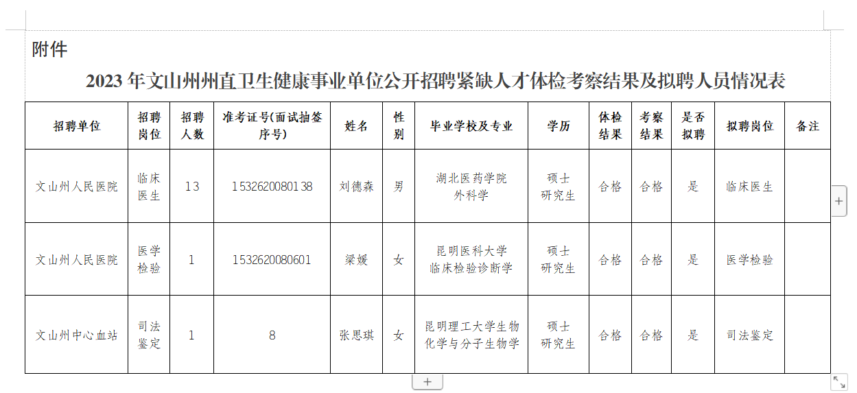 附件:2023年文山州州直衛(wèi)生健康事業(yè)單位公開招聘緊缺人才體檢考察結(jié)果及擬聘人員情況表