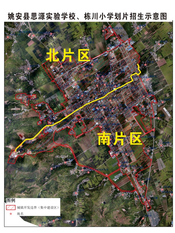 根據(jù)就近原則和學校實際情況進行如下劃分:以縣城老十字街中心延長線為分界線,向西延伸至姚安縣教師進修學校,向東延伸至迎曦廣場照壁后往北走至移動公司,再往東跨過南永公路至東街社區(qū)安置地與袁家橋交界處。以此條道路中心線以南的縣城建成區(qū)(以下簡稱“南片區(qū)”)為思源實驗學校的招生范圍;以此條道路中心線以北的縣城建成區(qū)(以下簡稱“北片區(qū)”)為棟川小學招生范圍,具體劃分情況如圖附后。