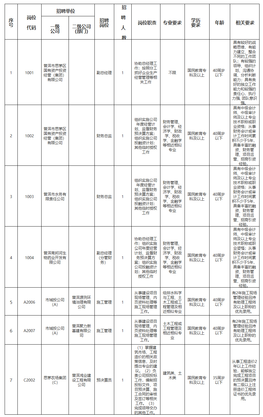 根據(jù)工作需要,結合崗位報名情況,擬對部分招聘崗位相關條件進行調整,如:將普洱市思茅區(qū)國有資產投資經營(集團)有限公司招聘副總經理(崗位代碼1001)的學歷要求由“國民教育本科及以上”調整為“國民教育??萍耙陨?rdquo;等。具體調整情況如下表:
