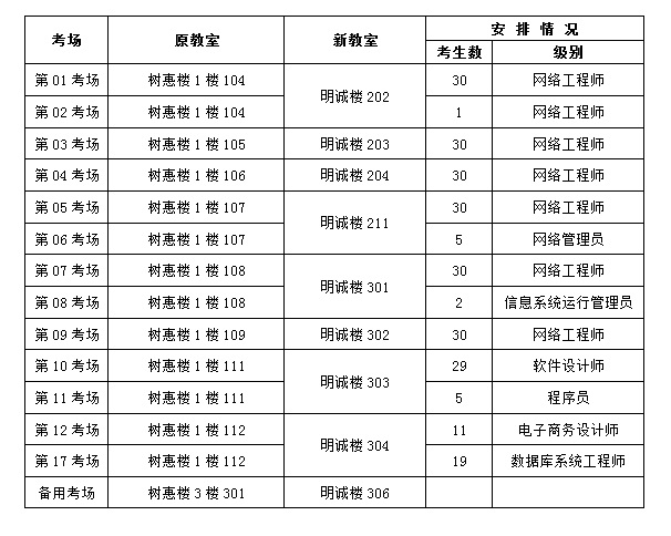 因2023年5月27日軟考筆試考場臨近同時(shí)開展大型校園招聘會(huì)的體育場,對(duì)考生答題造成較大干擾。經(jīng)研究決定,將原本設(shè)于樹蕙樓的筆試考場調(diào)整至明誠樓,考生的考場號(hào)、座位號(hào)不變,僅教室發(fā)生改變。請(qǐng)廣大考生前往調(diào)整后的考場參加考試。