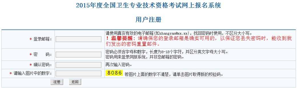 考生在網(wǎng)上報(bào)名系統(tǒng)登錄頁面處使用【注冊】功能,可進(jìn)行預(yù)報(bào)名注冊,注冊時(shí)請使用真實(shí)有效的電子郵箱(如zhangsan@xx.xx),找回密碼時(shí)使用,不區(qū)分大小寫。請確保登錄郵箱是真實(shí)可用的,以保證丟失密碼時(shí),能收到密碼重置郵件。