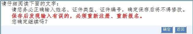 點(diǎn)擊“下一步”,提示個(gè)人信息是否填寫正確,點(diǎn)擊“確定”后如再發(fā)現(xiàn)基本信息有誤,無法在網(wǎng)報(bào)系統(tǒng)中進(jìn)行修改,考生須在登錄頁面重新注冊后重新報(bào)名。見下圖: