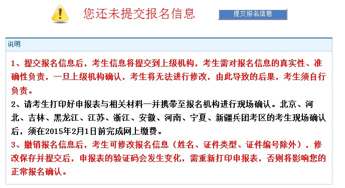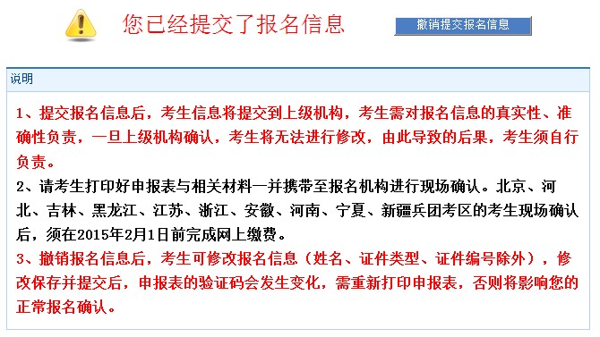 報(bào)名信息填寫完成,照片上傳成功后,考生應(yīng)仔細(xì)核對填寫信息是否準(zhǔn)確,核對確認(rèn)后須點(diǎn)擊“提交報(bào)名信息”進(jìn)行提交。報(bào)名信息提交后,考生不能在報(bào)名信息頁面進(jìn)行修改,如需修改信息,考生須點(diǎn)擊“撤銷提交報(bào)名信息”撤銷已提交的信息后再進(jìn)行修改信息的操作。