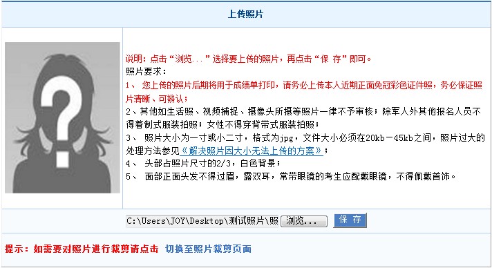 在上傳照片界面,仔細(xì)閱讀紅色提示(注:照片的大小為一寸或兩寸,文件大小必須在20kb-45kb之間),點(diǎn)擊“瀏覽”,上傳照片并“保存”。見下圖: