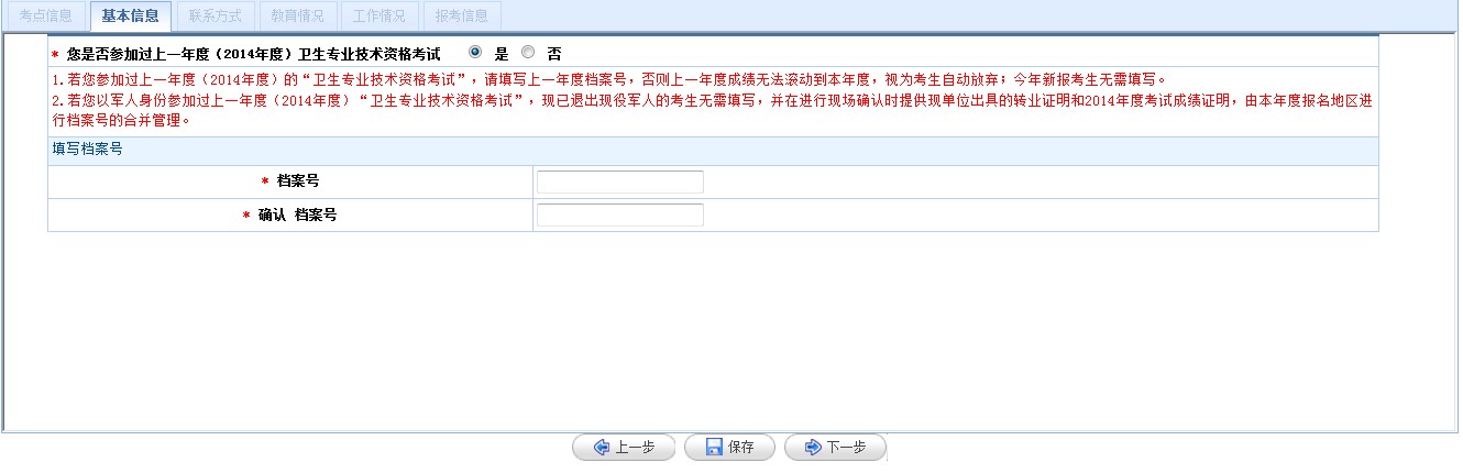 如果輸入信息正確無誤,點(diǎn)擊“確定”后系統(tǒng)會提示考生選擇是否參加過上一年度(2014年度)衛(wèi)生專業(yè)技術(shù)資格考試。首次參加考試的考生選擇“否”,歷史考生請選擇“是”,同時(shí)需輸入上一年度檔案號,點(diǎn)擊“下一步”后系統(tǒng)將自動調(diào)出該考生上一年度的報(bào)名信息,除姓名、證件類型、證件編號信息之外,考生可以對有變更的報(bào)名信息進(jìn)行修改。(注:考生如需修改姓名、證件類型、證件編號信息,請準(zhǔn)備相應(yīng)的證明材料,在規(guī)定的現(xiàn)場確認(rèn)時(shí)間內(nèi)到指定地點(diǎn)進(jìn)行修改。)