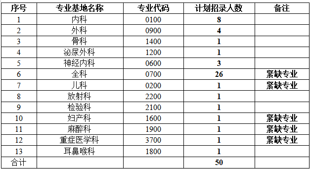 我院2023年度住院醫(yī)師規(guī)范化培訓(xùn)招收專業(yè)共13個(gè),招收計(jì)劃約為50人。(詳見(jiàn)下表)