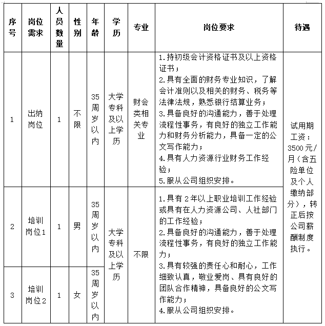澄江啟創(chuàng)職業(yè)培訓(xùn)學(xué)校有限公司計劃公開招聘工作人員3人,其中:出納崗位1人,培訓(xùn)崗位(男)招聘1人,培訓(xùn)崗位(女)招聘1人。報考人員在符合基本條件基礎(chǔ)上,需符合招聘崗位的招聘條件,具體崗位及資格條件詳見下表: