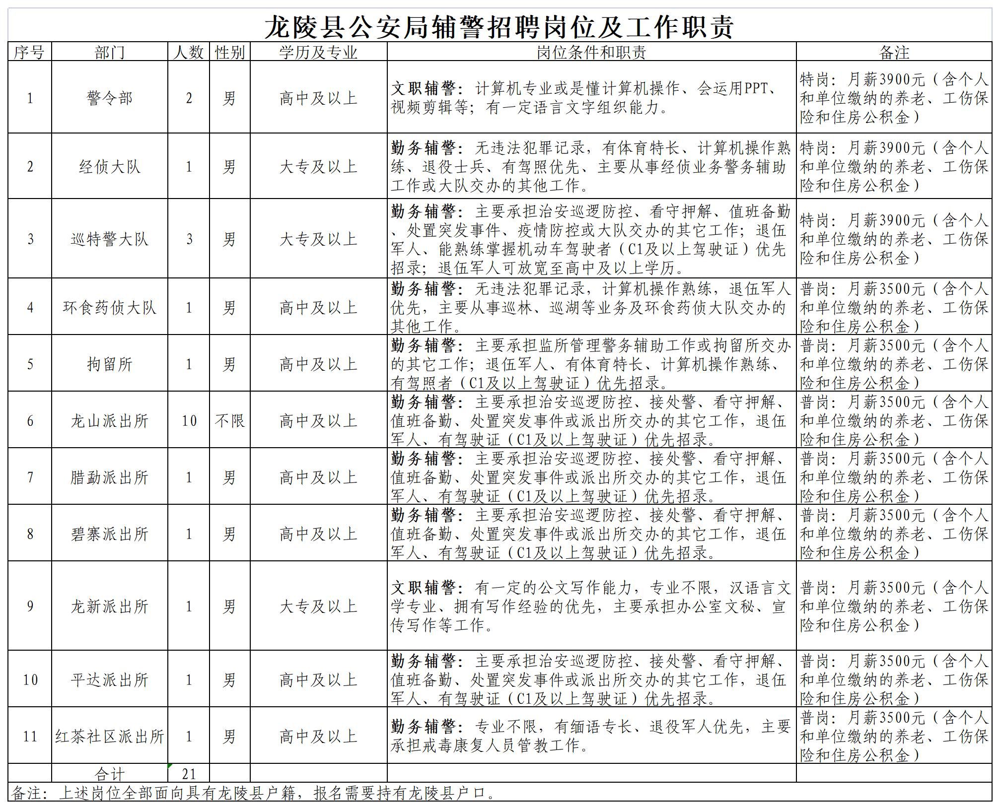 共招聘警務(wù)輔助人員21人,經(jīng)綜合考核后,確定聘用的警務(wù)輔助人員與龍陵縣公安局按規(guī)定程序訂立勞動(dòng)合同,招聘崗位、條件等詳見(jiàn)附件。