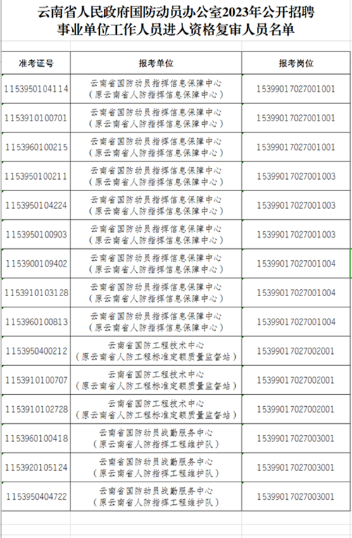 根據(jù)3月16日發(fā)布的《2023年云南省人民政府國防動員辦公室公開招聘人員公告》,現(xiàn)將資格復(fù)審人員名單及相關(guān)事項公告如下: