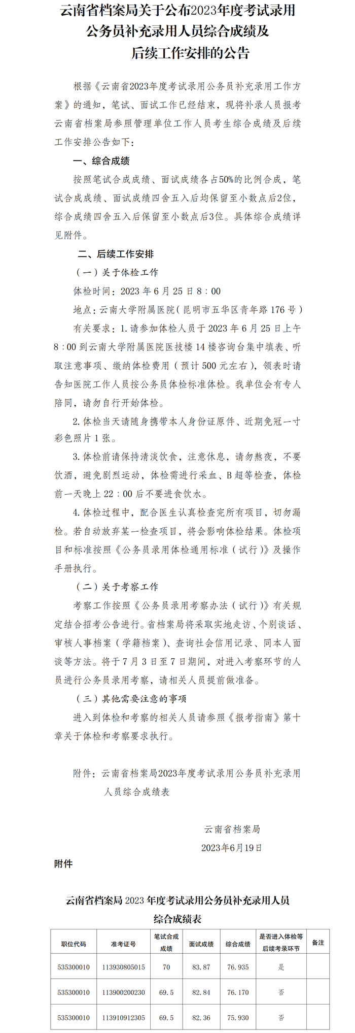 云南省檔案局 關于公布2023年度考試錄用公務員補充錄用人員 綜合成績及后續(xù)工作安排的公告 來源:http://www.ynda.yn.gov.cn/html/2023/tongzhigonggao_0620/6247.html