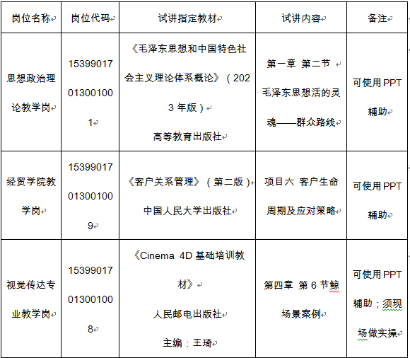 思想政治理論教學(xué)崗和經(jīng)貿(mào)學(xué)院教學(xué)崗位采用“試講+結(jié)構(gòu)化面試”的方式進(jìn)行測試。“試講+結(jié)構(gòu)化面試”時間20分鐘(試講15分鐘,結(jié)構(gòu)化面試5分鐘)。