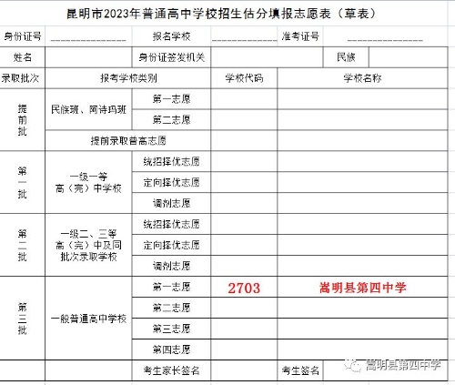 志愿填報:第三錄取批次第一志愿代碼:2703 嵩明縣第四中學。