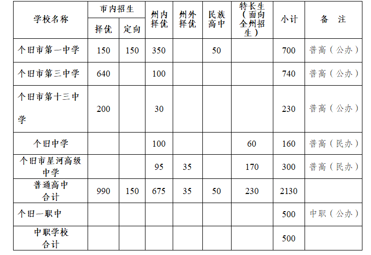 學(xué)校 | 畢業(yè) 學(xué)生數(shù) | 個(gè)舊一中定向擇優(yōu)分配數(shù) (人) | 備注 |