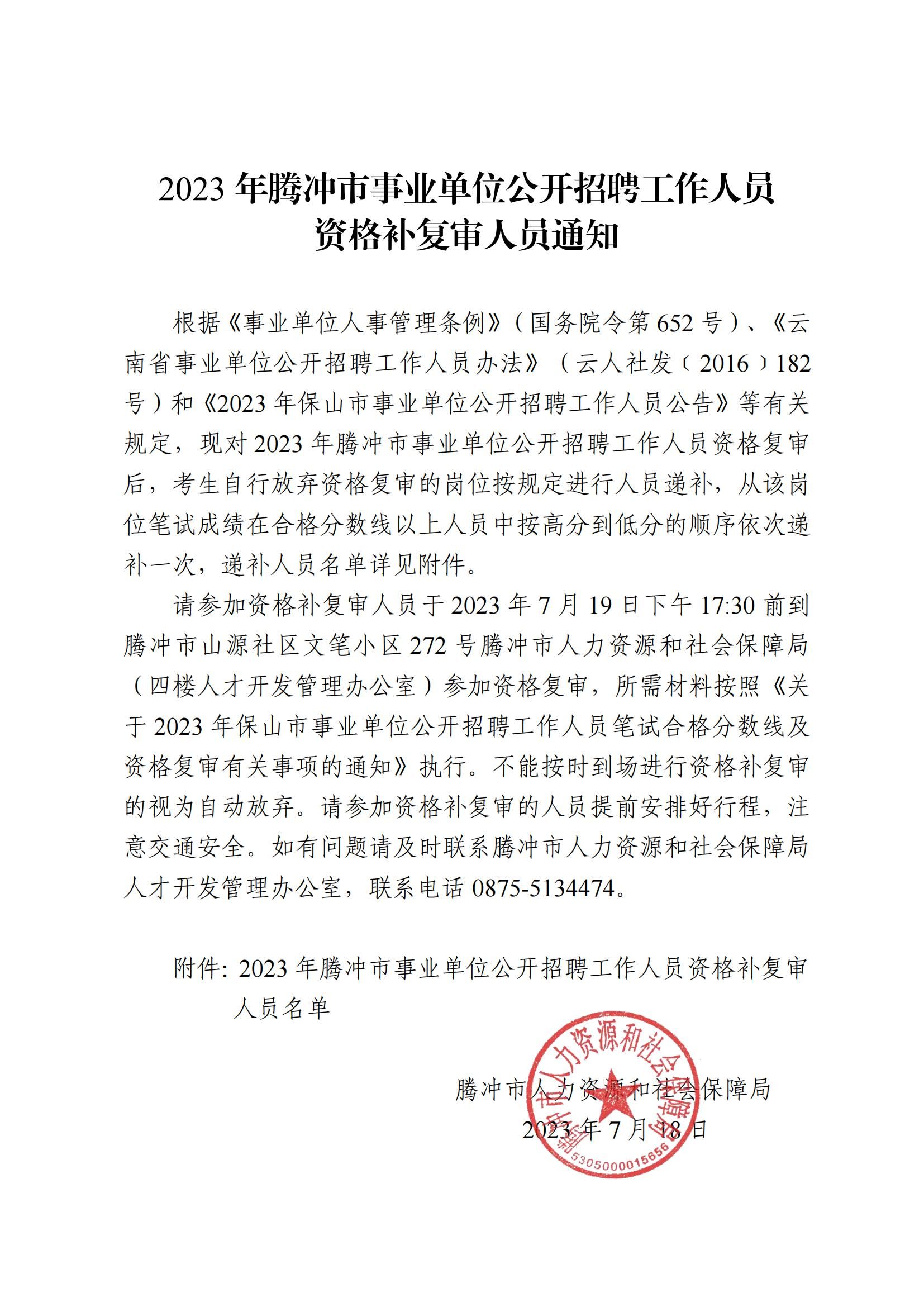 2023年騰沖市事業(yè)單位招聘工作人員資格補(bǔ)復(fù)審人員通知