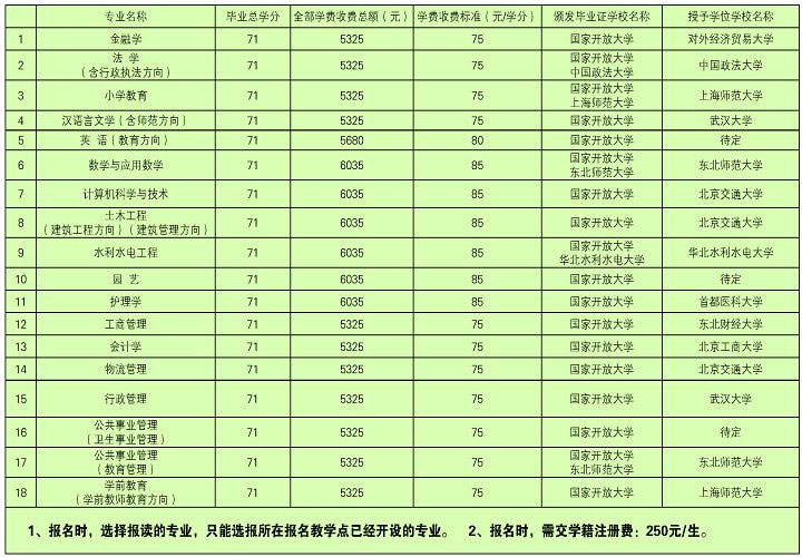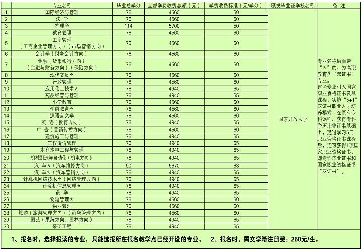 報(bào)名手續(xù):1、報(bào)名時(shí),須交驗(yàn)有效畢業(yè)證書原件;提交身份證和畢業(yè)證書復(fù)印件各1份,免冠數(shù)碼電子照片1份,電子照片要求為彩色圖像、背景為藍(lán)色、被拍攝人著白色或淺色系衣服、150(寬)×210(高)像素、文件大小不能超過40K,并按照1人1個(gè)圖像文件的方式存儲,圖像文件格式為“jpg”;2、填寫《國家開放大學(xué)(中央廣播電視大學(xué))“開放教育”學(xué)生報(bào)名登記表》和《入學(xué)資格承諾書》;3、交納學(xué)籍注冊建檔費(fèi)250元。其中: