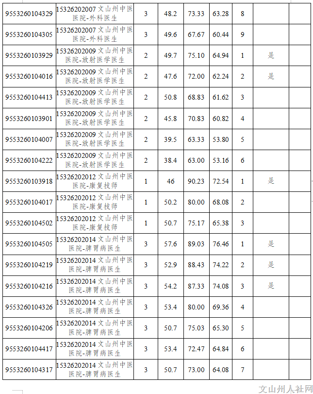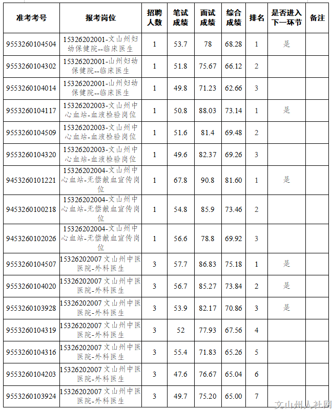 根據(jù)《2023年文山州州屬事業(yè)單位公開選調工作人員通告》和《2023年文山州州屬事業(yè)單位公開選調工作人員筆試成績及資格復審有關事項通告》要求,文山州衛(wèi)生健康委所屬事業(yè)單位州婦幼保健院、州中心血站、州中醫(yī)醫(yī)院于2023年7月18日、21日進行了面試,現(xiàn)將面試成績和后續(xù)有關事項通告如下。