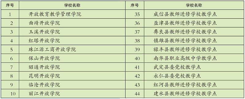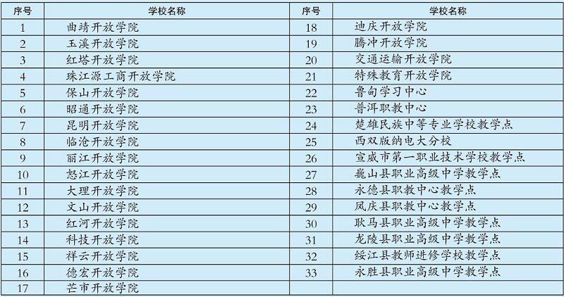 3、招生學院:由經(jīng)批準開展遠程開放教育本科招生的云南開放大學相關專業(yè)學院實施定點集中招生,具體招生學院名單: