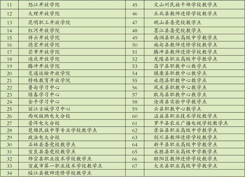 3、招生學校:經(jīng)批準開展遠程開放教育專科招生的云南開放大學相關開放學院、分校、教學點,具體招生學校名單: