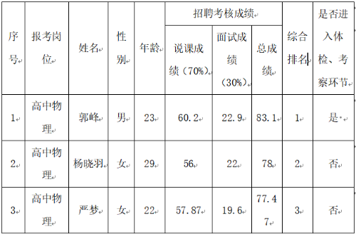 根據《昆明市晉寧區(qū)第二中學2023年公開招聘臨聘教師招聘簡章》,學校于2023年7月27日對報考我校高中物理教學崗位資格復審通過的3位教師進行說課、面試考核,郭峰以總成績83.1分,綜合排名第一,將進入體檢、考察環(huán)節(jié);具體情況公示如下: