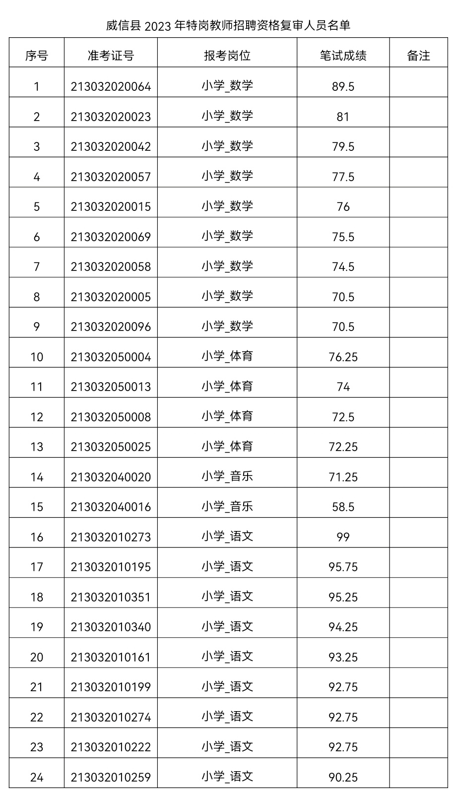 2023年報考威信縣特崗教師的考生,根據(jù)筆試成績高低,按照1:2的比例確定進入資格復審人員。資格復審出現(xiàn)放棄或不合格人員的崗位,在本縣(區(qū))同崗位筆試成績最低分數(shù)控制線以上人員中按筆試成績從高到低依次遞補,遞補后仍未達到面試比例的崗位不再遞補,可據(jù)實面試。參加資格審查的考生必須本人到場,否則不予受理。資格復審人員名單見附件。