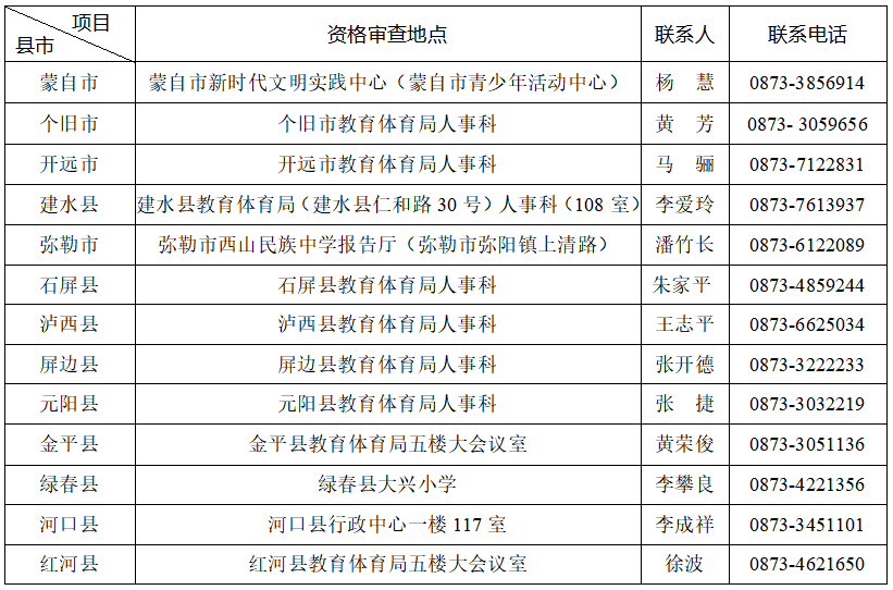 紅河州(除金平縣外)2023年中央特崗教師招聘現(xiàn)場(chǎng)資格復(fù)審時(shí)間為2023年8月7日,上午8:30—11:30;下午14:30—17:30。金平縣2023年中央特崗教師招聘現(xiàn)場(chǎng)資格復(fù)審時(shí)間為2023年8月8日,上午8:30—11:30;下午14:30—17:30。設(shè)崗縣市資格復(fù)審地點(diǎn)如下:
