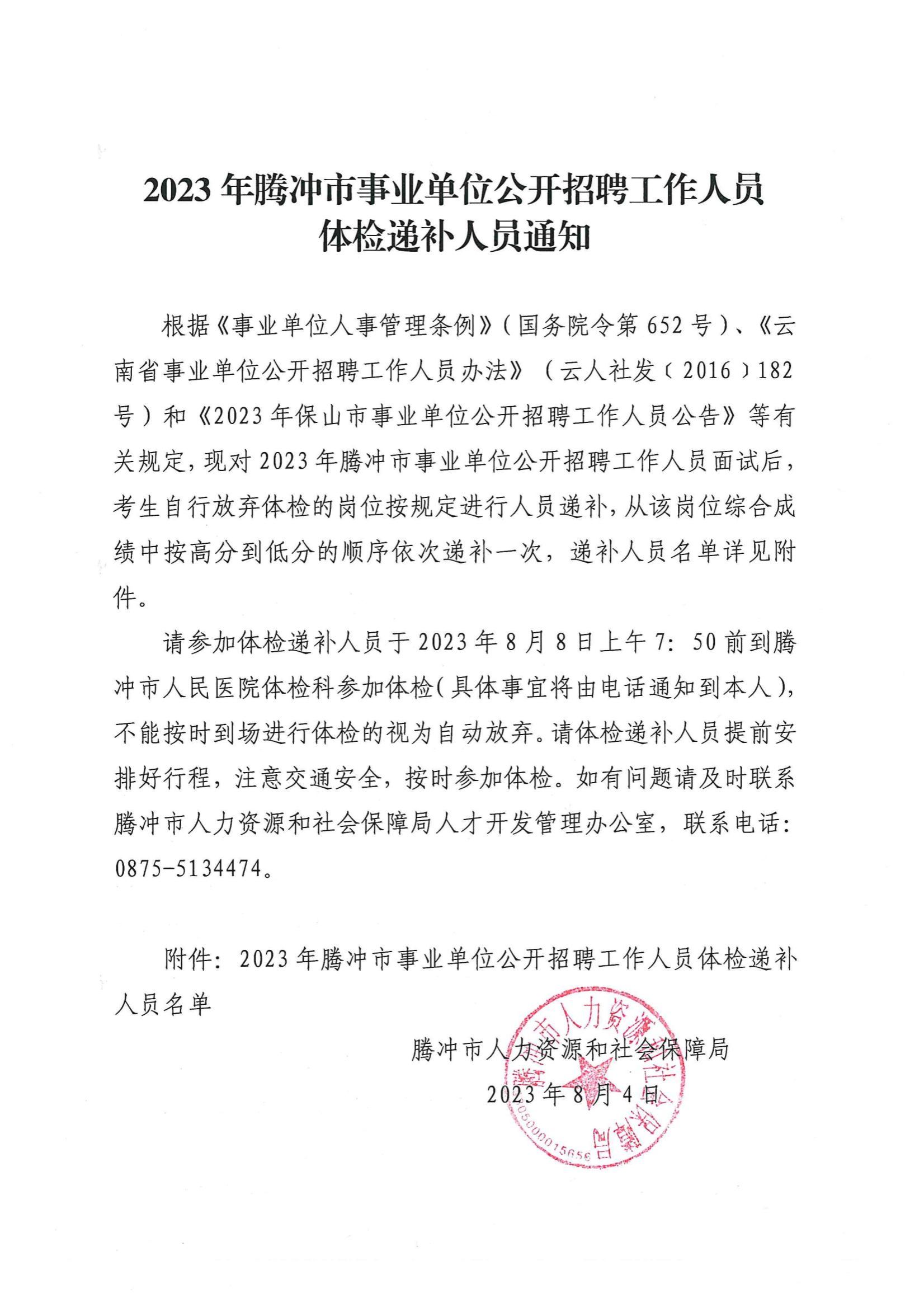 2023年騰沖市事業(yè)單位招聘工作人員體檢遞補(bǔ)人員通知