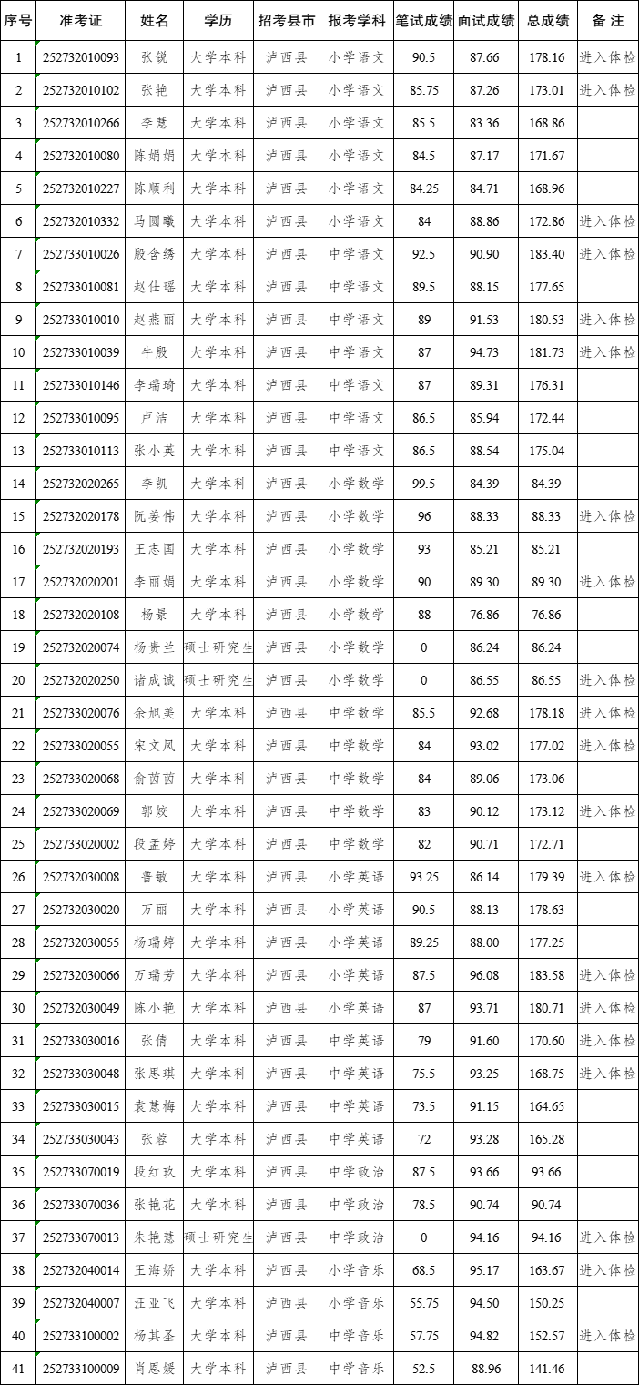 瀘西縣2023年中央特崗教師招聘成績(jī)公告