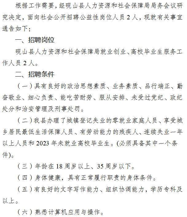 硯山縣人力資源和社會保障局面向社會公開招聘公益性崗位人員公告