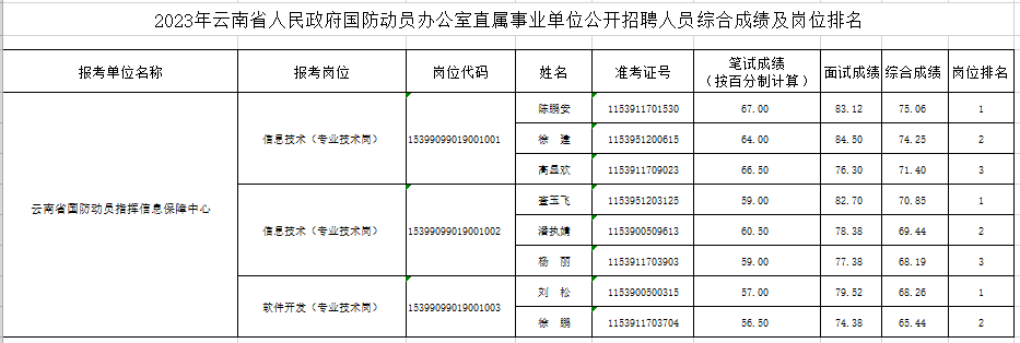 附件:2023年云南省人民政府國防動員辦公室直屬事業(yè)單位公開招聘人員綜合成績及崗位排名.xls