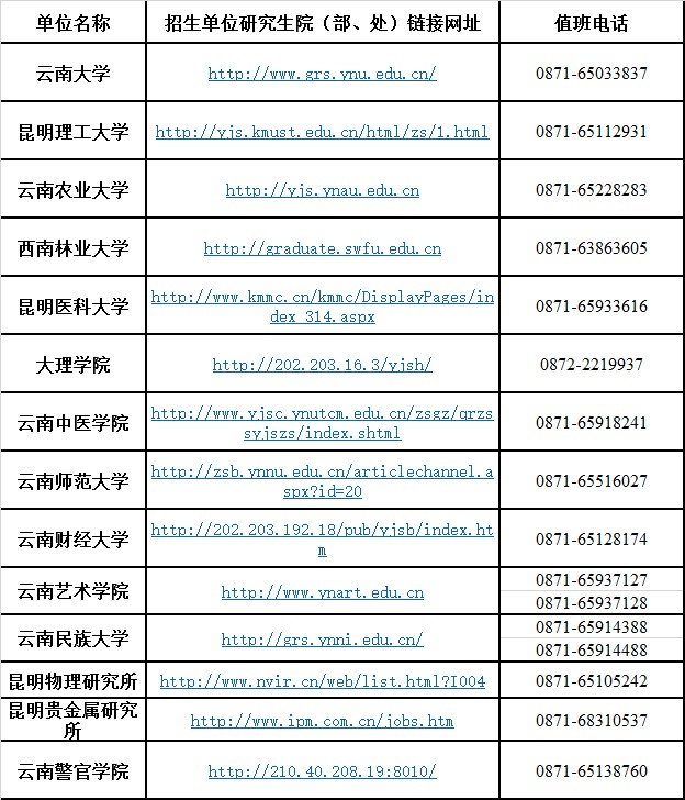 2015年云南省碩士研究生招生單位成績(jī)復(fù)核期間聯(lián)系方式