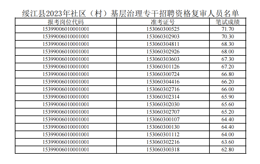 從筆試成績達到云南省2023年社區(qū)(村)基層治理專干招聘昭通市崗位合格分數(shù)線以上人員中,按照成績由高到低的順序,等額確定資格復審人員,如最后一名考試成績并列的,一并進入資格復審,名單見附件。