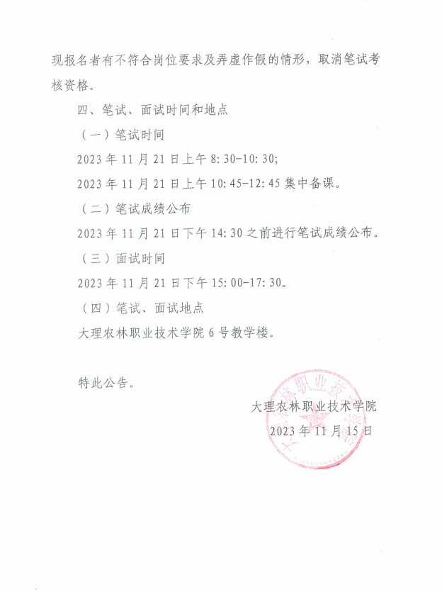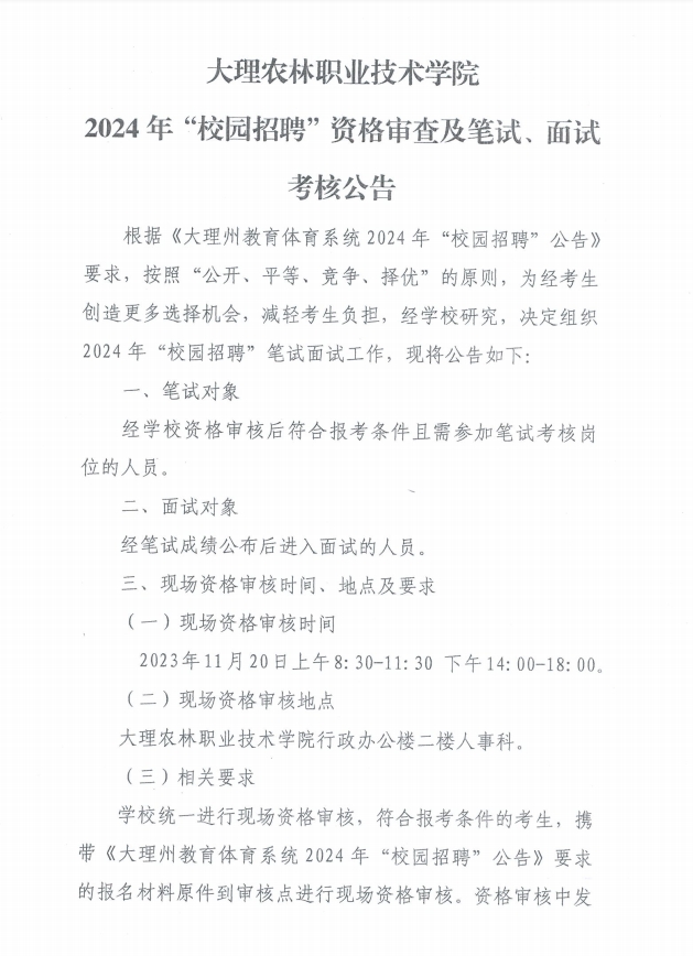 大理農(nóng)林職業(yè)技術(shù)學(xué)院2024年”校園招聘“資格審查及筆試、面試考核公告