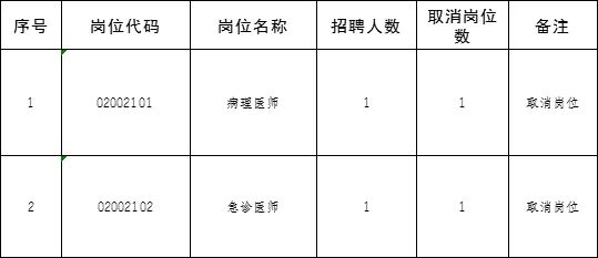 按照《云南省事業(yè)單位公開招聘工作人員辦法》(云人社發(fā)〔2016〕182號)、《云南省衛(wèi)生健康委所屬和聯(lián)系單位2023年面向“省管縣用”醫(yī)務(wù)人員公開招聘的公告》的有關(guān)要求,云南省阜外心血管病醫(yī)院2023年“省管縣用”醫(yī)務(wù)人員公開招聘因報名人數(shù)未達到開考比例,現(xiàn)將取消崗位情況進行公告。取消崗位如下: