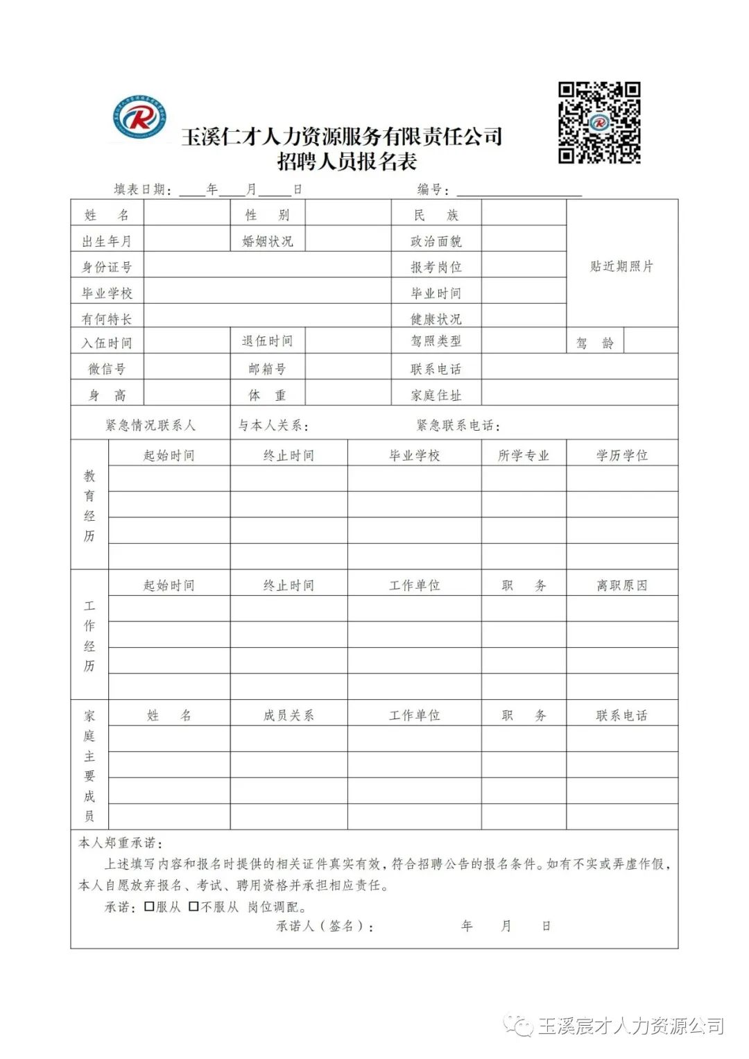 附件:玉溪仁才人力資源服務有限責任公司招聘人員報名表。