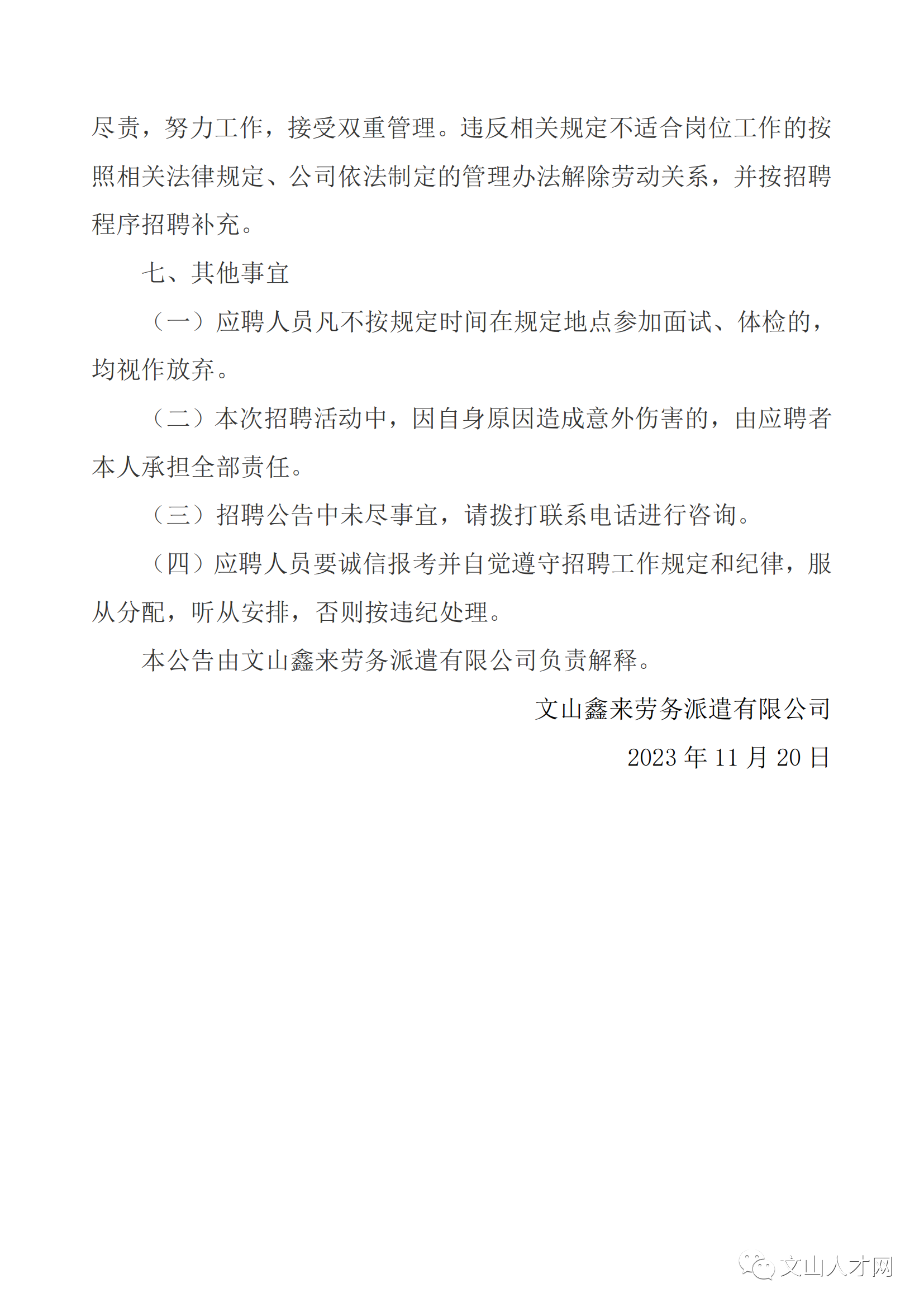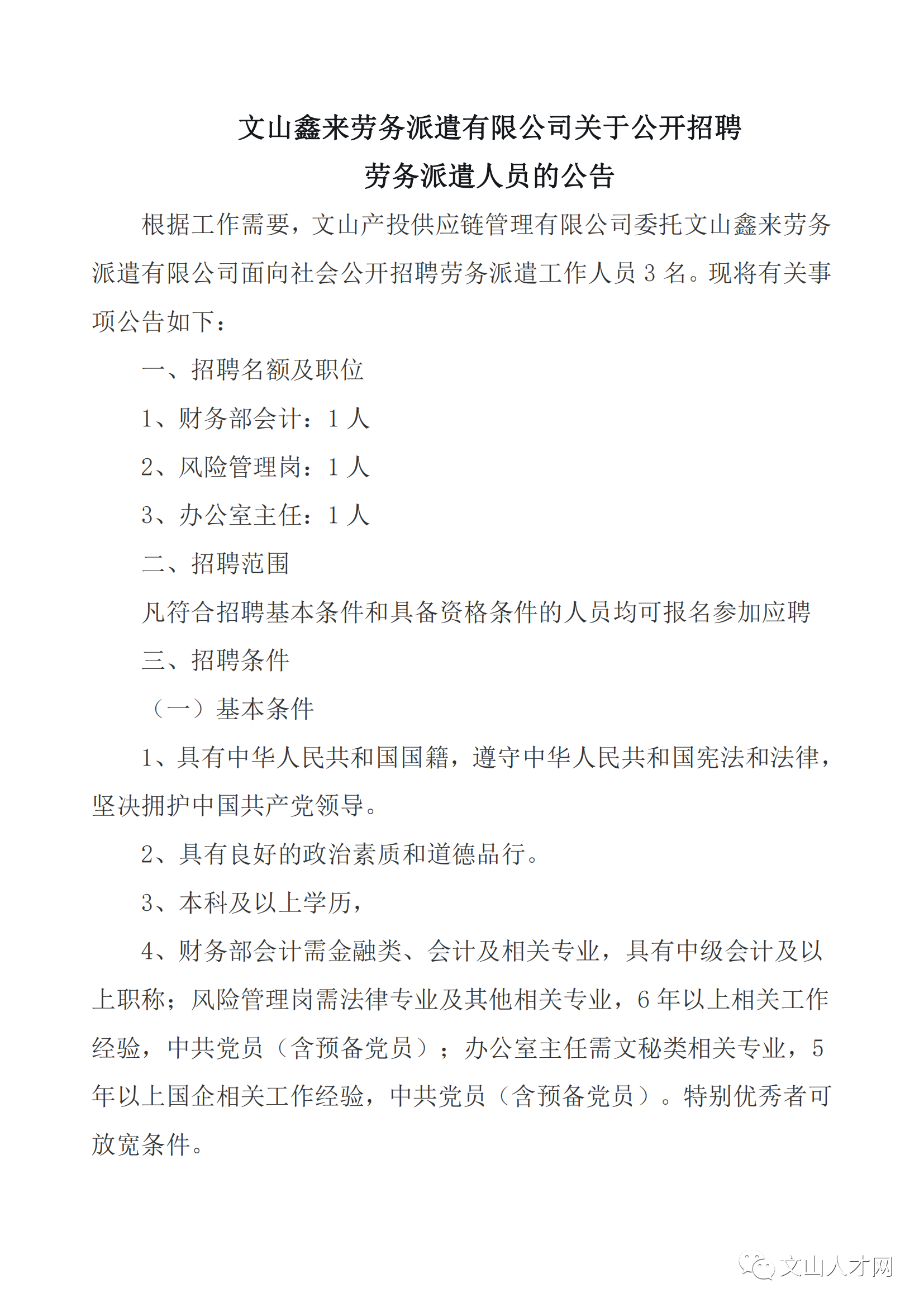 文山鑫來勞務(wù)派遣有限公司面向社會公開招聘3名勞務(wù)派遣工作人員