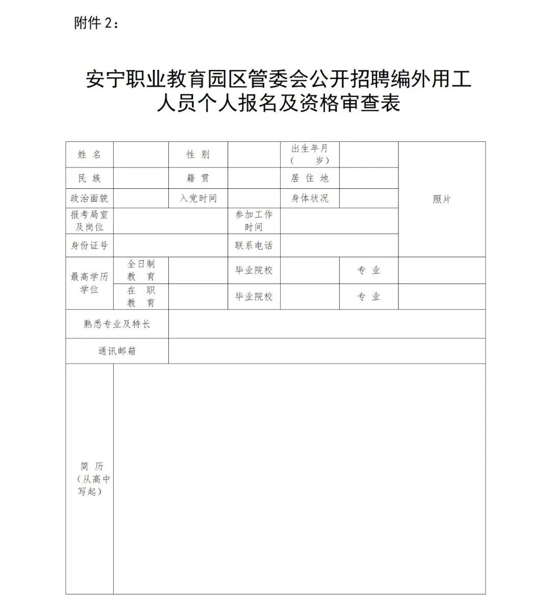 2.安寧職業(yè)教育園區(qū)管委會(huì)公開(kāi)招聘編外用工人員個(gè)人報(bào)名及資格審查表