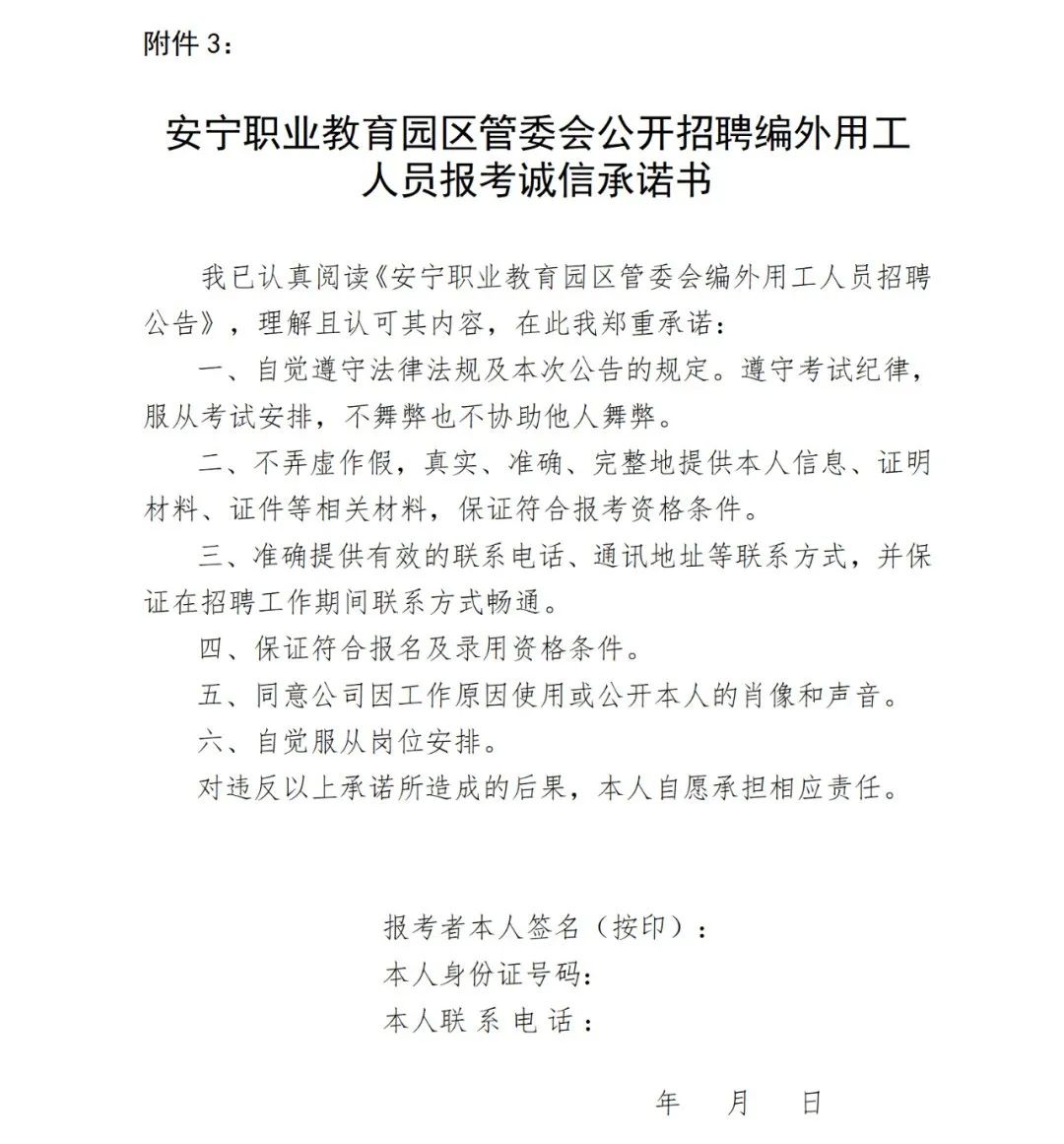 3.安寧職業(yè)教育園區(qū)管委會(huì)公開(kāi)招聘編外用工人員報(bào)考誠(chéng)信承諾書(shū)